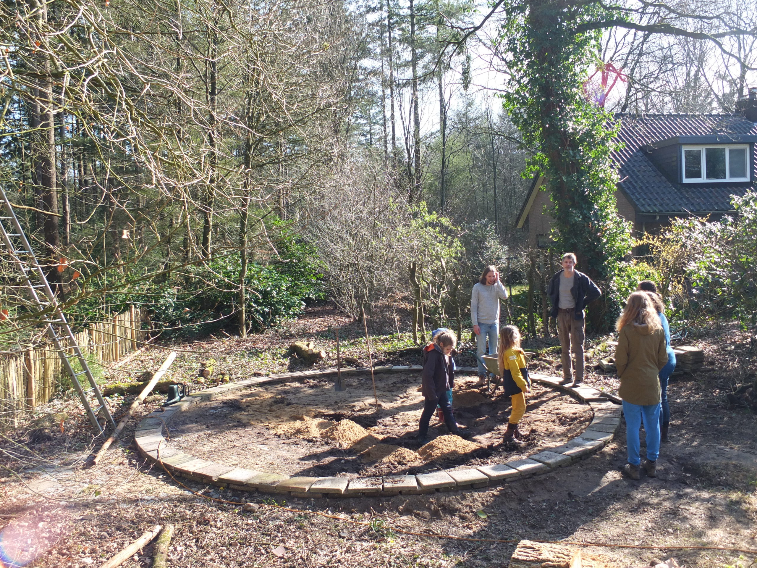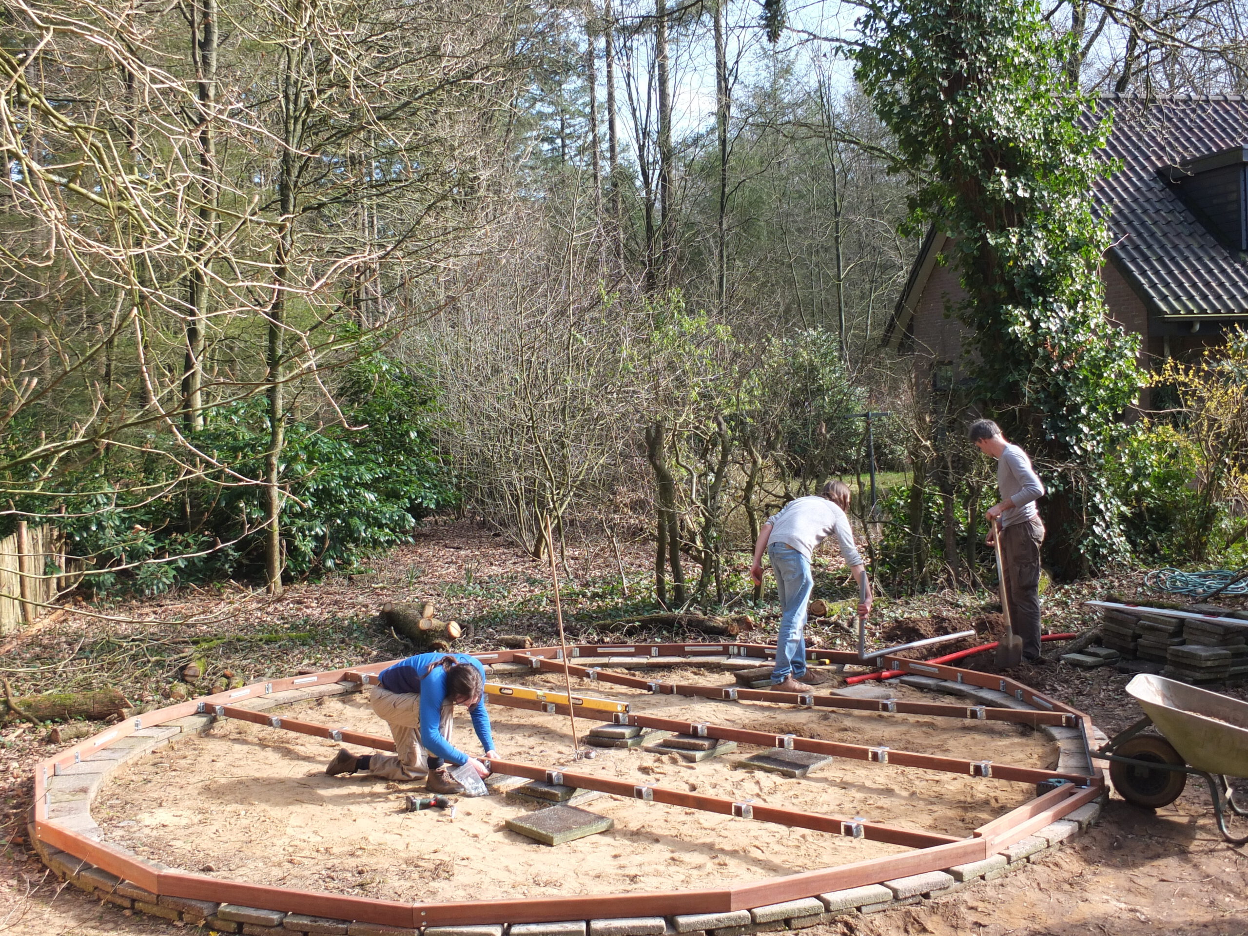 Daarna moest het terrein klaar worden gemaakt voor de plaatsing van de houten yurt. We besloten een fundatie te bouwen van stoeptegels om het geheel te dragen. Omdat de yurt een bijna ronde vorm heeft hebben we een cirkel van stoeptegels gemaakt en deze met de waterpas uitgelijnd. Daarna kan de vloer van de yurt worden opgebouwd.
