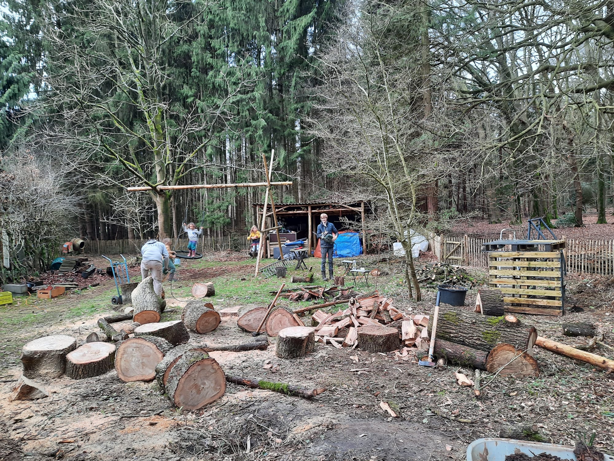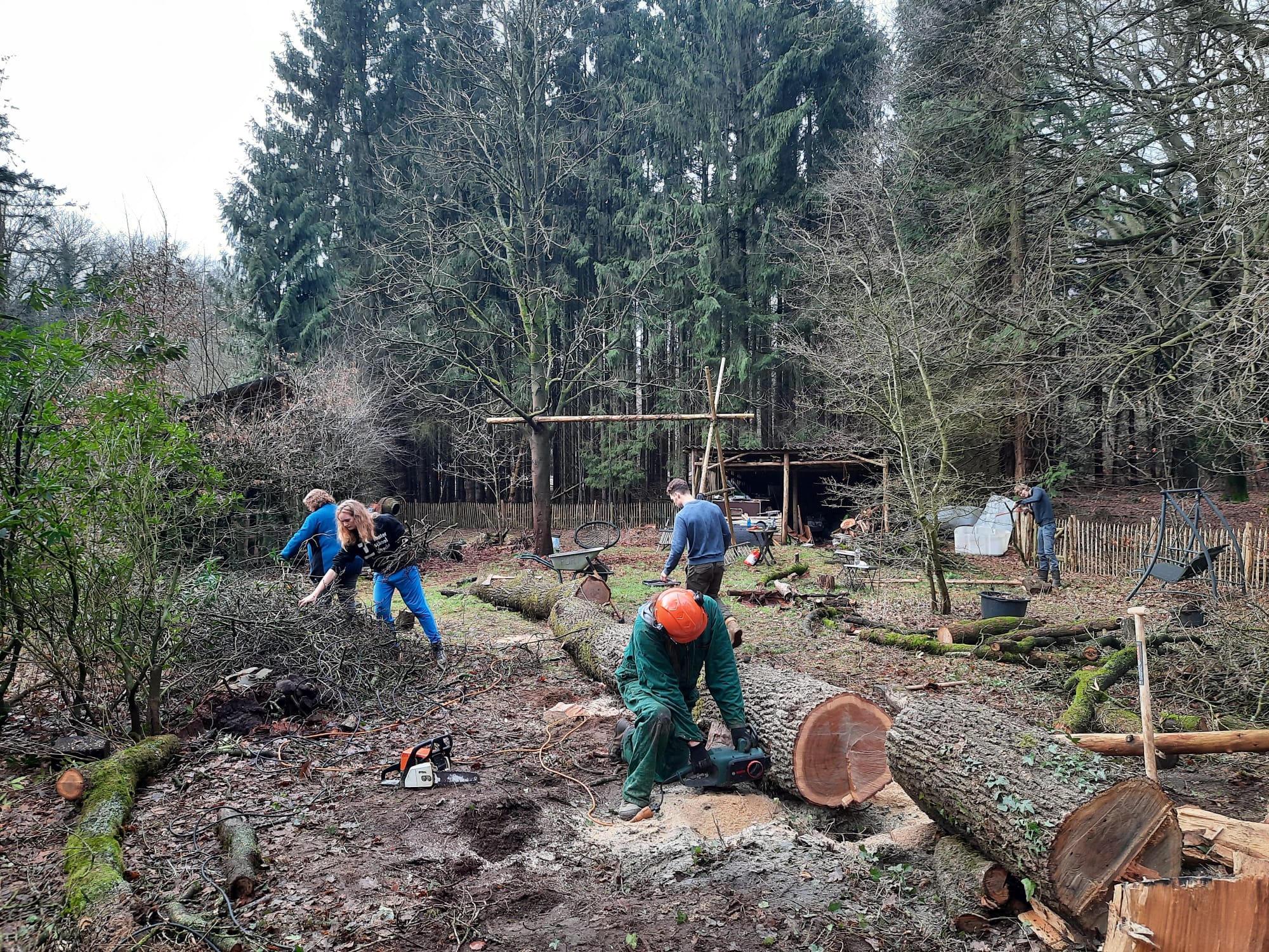 Eind vorig jaar kwamen we in contact met Ronald uit Putten. Hij was op zoek naar mensen om langere tijd mee samen te werken op zijn terrein. Een ideale broedplaats voor onze ideeën… en het plaatsen en uittesten van de houten yurt! Ronald was enthousiast en zo konden we de eerste voorbereidingen gaan treffen voor het plaatsen van het huisje. Op de plek waar de yurt zou komen stond nog een grote eik waarvan al gepland was dat deze weg zou worden gehaald. We besloten dit als eerste community project op te pakken en de boom tot brandhout te verwerken. Een hele klus!