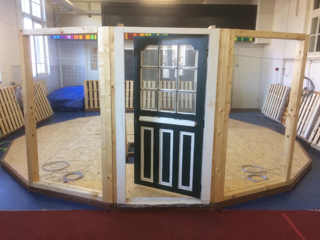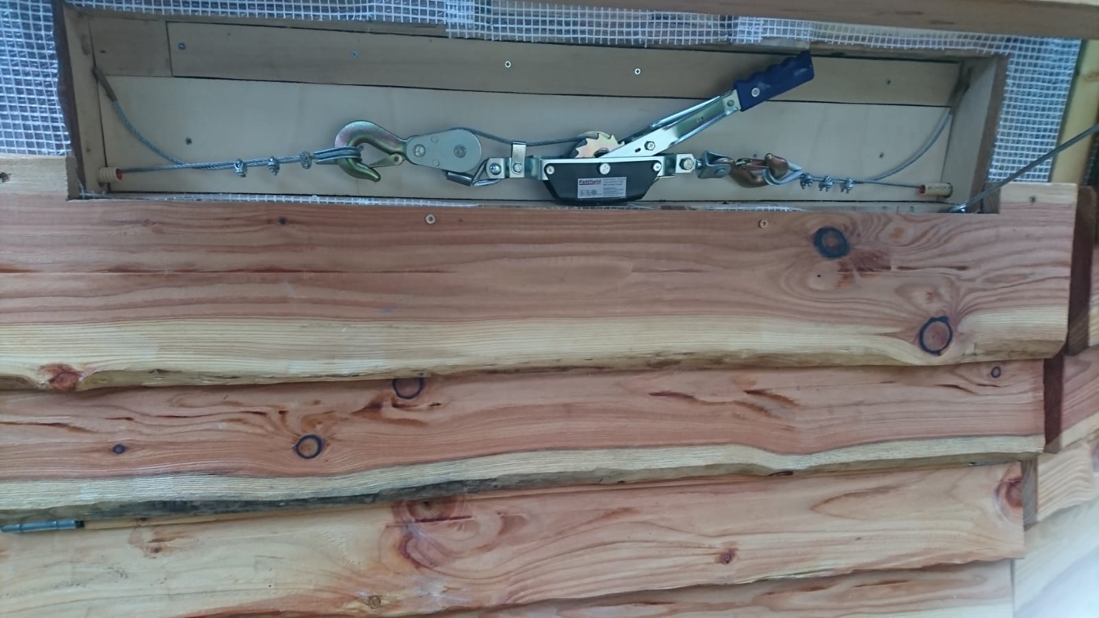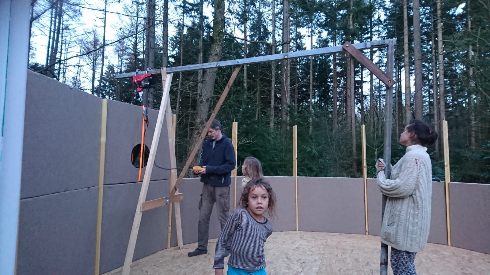 De yurt bestaat uit drie delen die op elkaar geplaatst worden: de vloer, de wanden en het dak. Nadat de vloer is gelegd, is het tijd om de wanden, de deur en de ramen te plaatsen. De wanden bestaan uit twee pallets die op elkaar worden geplaatst. Deze pallets zijn volledige modules met houten bekleding aan de buitenkant en stoffen bekleding aan de binnenkant. Daartussen zit isolatiemateriaal. De tweede pallet tillen we op zijn plek met een zelfgemaakt hijskraantje. De wanden worden met elkaar bevestigd door staalkabels die met spanners worden aangetrokken.