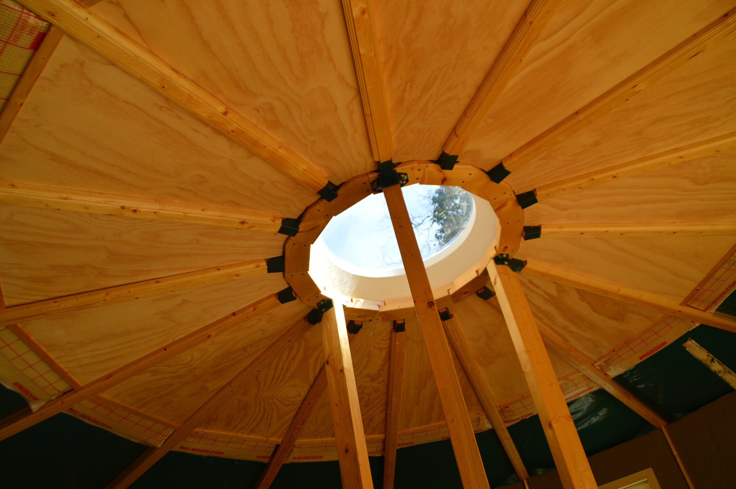 Als laatste wordt het dak geplaatst. In het midden de steunkolommen met een koepel met dakbalken die op de wanden rusten. Daaroverheen komt het zeildoek. Aan de binnenkant komen houten platen ter bekleding. Tussen de dakplaten en het zeil zit isolatiemateriaal.