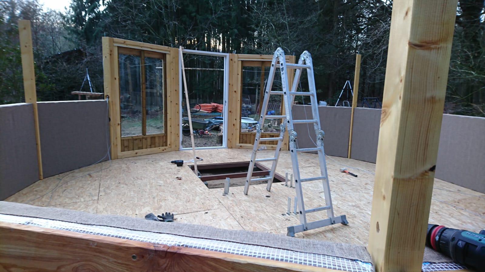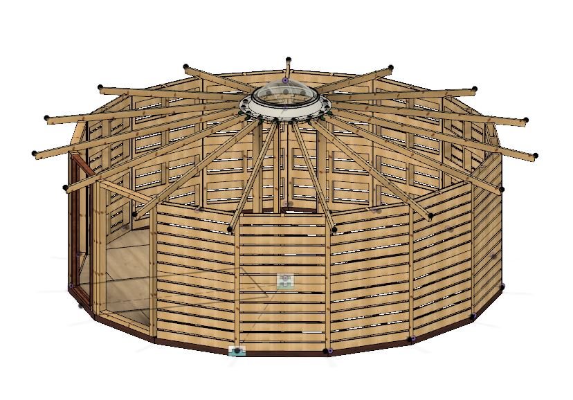 Het begon allemaal zo’n twee jaar geleden met een idee en wat losse schetsjes op papier. Het idee om een huisje te bouwen van hout, gebaseerd op het idee van een yurt. Op te bouwen uit modules en dus verplaatsbaar, maar met de voordelen van hout: beter bestand tegen het Nederlandse weer dan de traditionele Mongoolse yurt en ook beter geïsoleerd. Ik werkte wat tekeningen uit op de computer om een globaal idee te krijgen van hoe het eruit zou komen te zien, hoeveel materiaal ik nodig zou gaan hebben en wat de kosten ongeveer zouden gaan worden. Ik besloot pallets te gebruiken voor de basis van de wanden en PVC zeildoek (vrachtwagenzeil) als dakbedekking. Langzaam maar zeker begon het idee vorm te krijgen.
